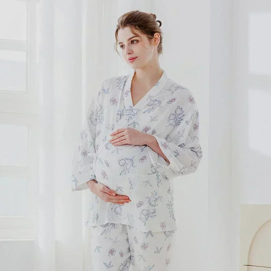 Organic Cotton Muslin Wrap Maternity Pajama Set- Flowers