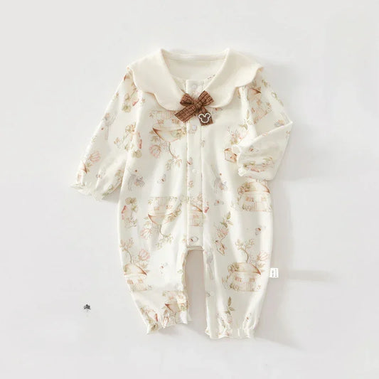 100% Cotton Long Sleeve Snap-Up Romper - Bowknot with Flowers