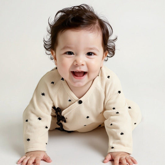 Cotton Long Sleeve Kimono Romper - Beige Star