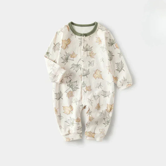 100% Cotton Long Sleeve Kimono Romper - Brown Leaves