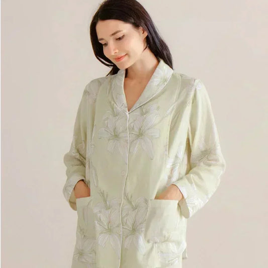 100% Cotton Muslin Maternity & Nursing Pajama Set- Green Spring Leaves