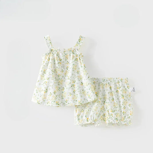 100% Cotton Spaghetti Strap Top & Pants Set - Yellow Spring Floral