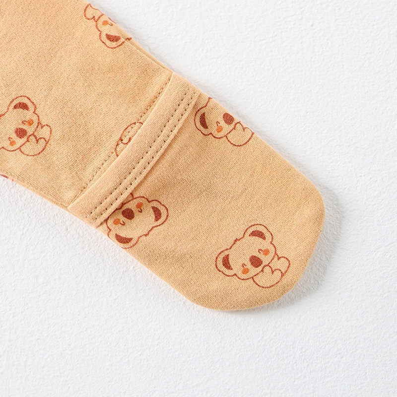 - Baby-footed onesie with mittens safely and warmly protects baby's feet and hands.