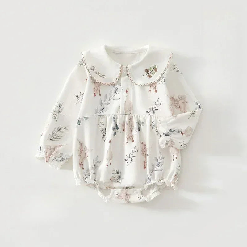 100% Cotton Long Sleeve Overhead Bodysuit - White Crane