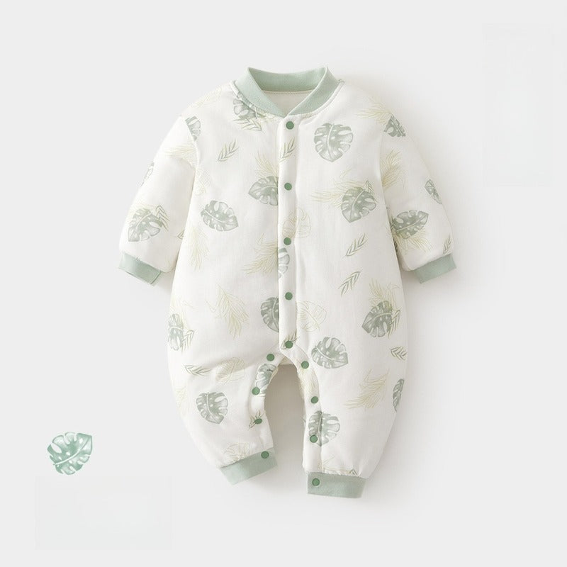 100% Cotton Quilted Long Sleeve Snap-Up Romper - Green Leaves